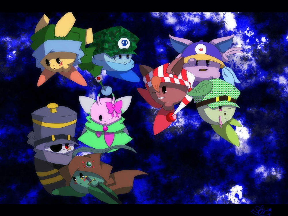 茶色い布巻きがジュプトルの緑風(リョフウ)、縦に長い帽子がヨノワールの闇瑠璃(ヤミルリ)、ピンクの触覚がセレビィ(色違い)の桃歌(モカ)